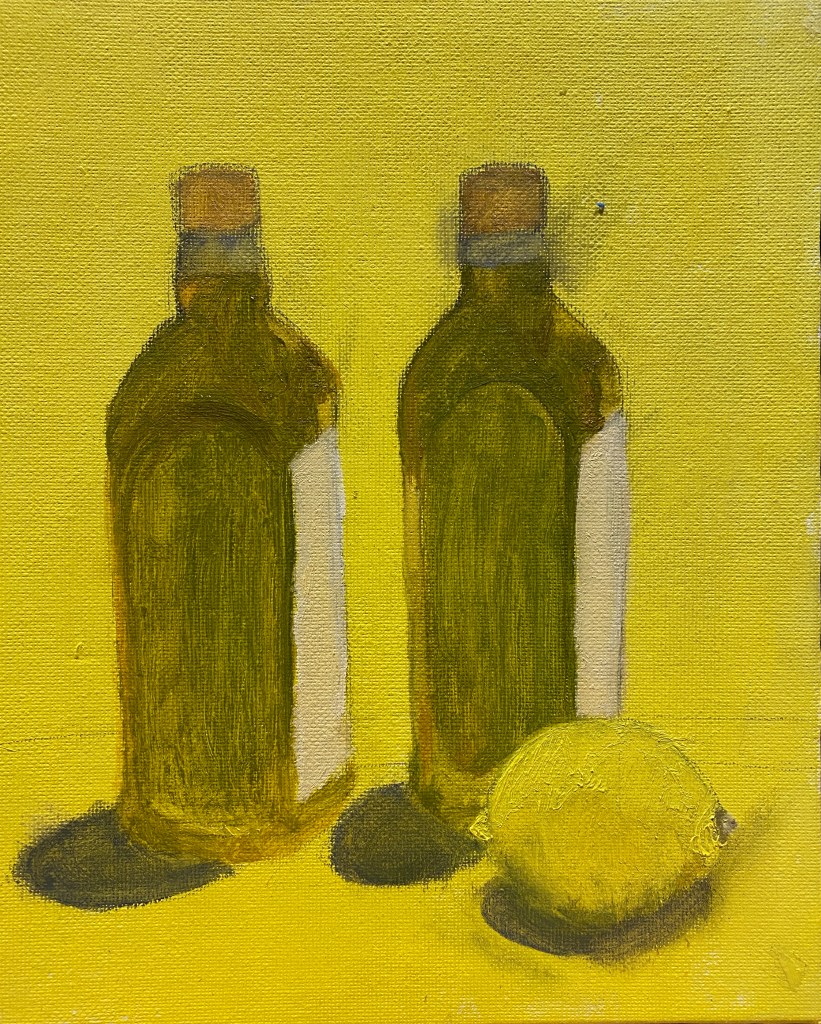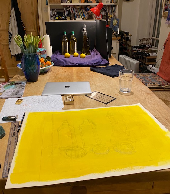 My initial idea for this assignment was to carry on painting lemons, or other fruit, in the same style as the lemons that I had done earlier, perhaps in a bowl. However, it seemed to me that this was a rather easy way to tackle the assignment and I should try something different – that I hadn’t done already – and challenging. Given that it was during the days between Christmas and New Year, 2020, the forthcoming departure of the UK from the EU was very much on my mind, and I started thinking about the stockpile that we had made in anticipation (I have never stockpiled anything before, even during the first lockdown of the coronavirus crisis, as we live very near the shops, but for Brexit, to which I am passionately opposed, it feels somehow legitimate). I started thinking about how precious things like olive oil are going to become, now that it will be more difficult to trade with the countries that produce them. So I decided to try to produce a version of those seventeenth century still lifes, portraying riches from foreign lands – because it seems rather possible that we might once again think about European goods in the same way. I remember as a child that we had just one tiny bottle of olive oil, that was used sparingly and would be replenished whenever my father travelled for work. So now the ten or so bottles of olive oil that we have in our cellar seem very precious to me, and I thought might make a good subject for a still life.