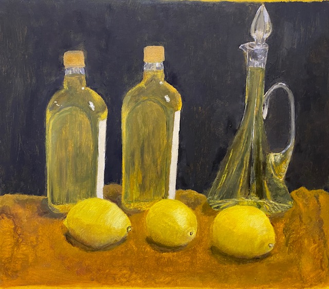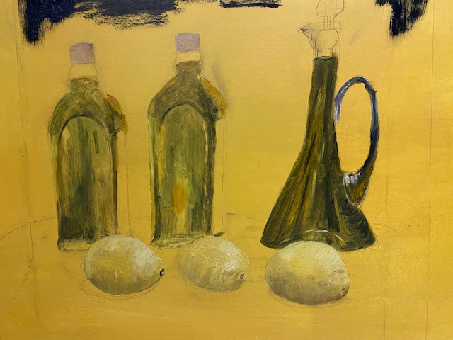 The painting went through various iterations after this, not necessarily for the better. One huge issue I faced was what colour to paint the background to the lemons and the lower part of the oil bottles. I actually really liked the vivid yellow, it made the whole image sunny and bright and reminiscent of mediterranean feelings, so much part of what we are leaving behind with Brexit. In some ways I wish I had left it this way, but of course it looks unfinished, and at the time I couldn’t think of a way to make it less so. Looking at it now however, I think I could have finished it like this, even if it meant painting over the yellow acryllic with oil paint, it would have looked fine once the yellow border was clipped off, and if I were to do it again, that is what I would do.