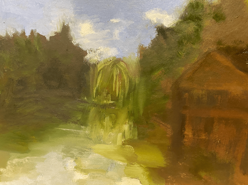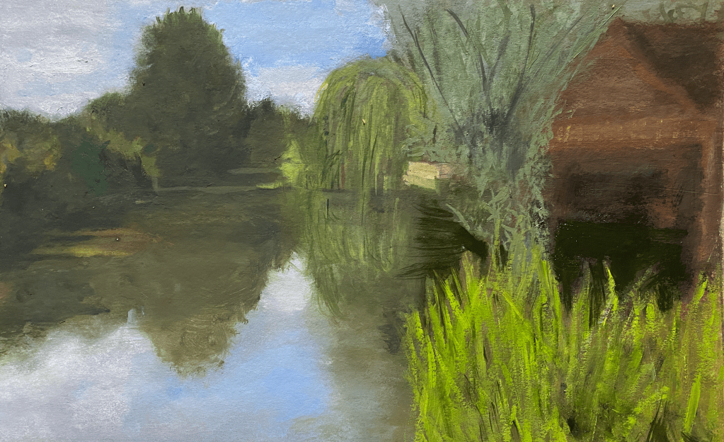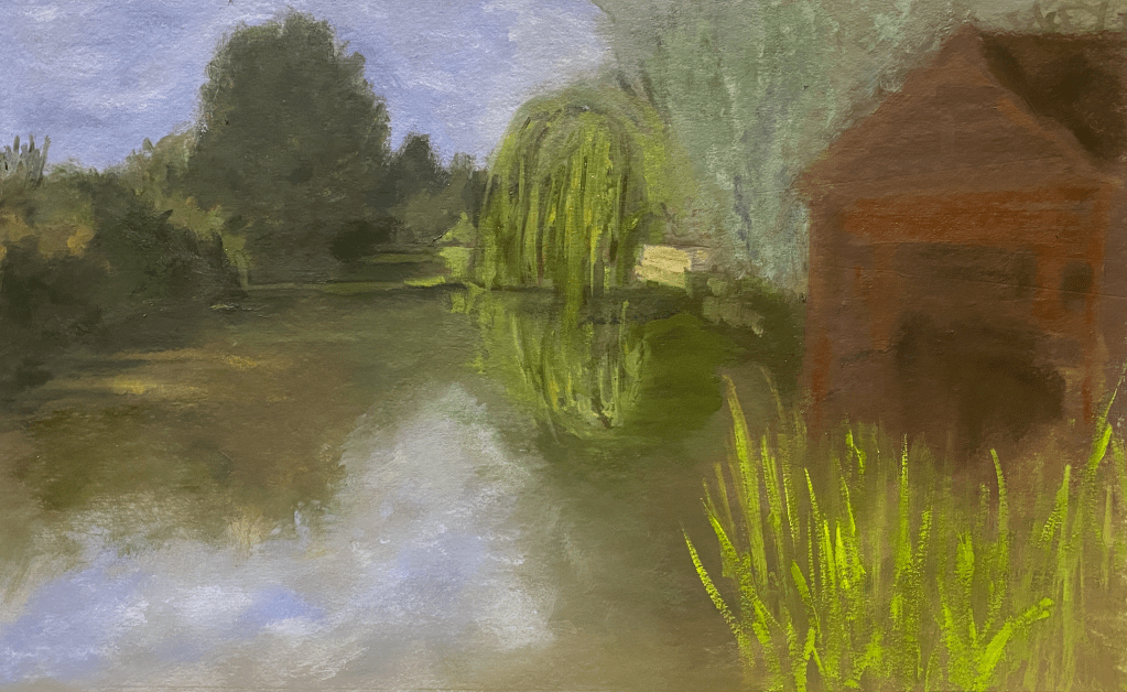 Here is the image with a little more working. I quite like the way the boathouse turned out, and the darkness of the hedges and shadows on the left. But the willow tree at the back is all wrong – too big, given the distance away.