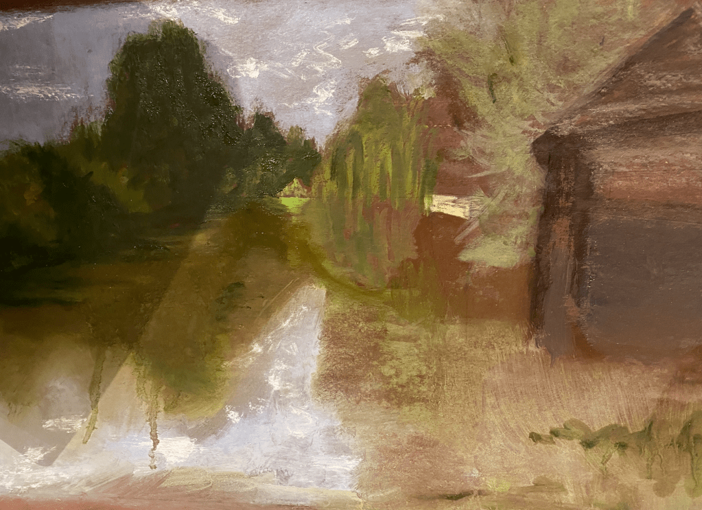Finally here is the ultimate version, where I have tried to add some detail, and correct mistakes I had perceived in the perspective and so on. Underneath the boathouse is darker, and I have added some definition to the grey green plant in the middle area. I have struggled some more with the reflection of the willows, although not with a very satisfactory result.